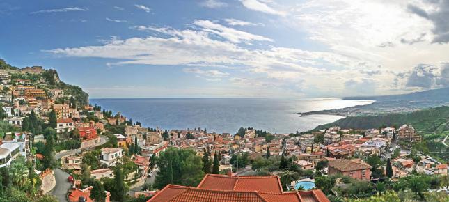Strand OR meer Kunstdruck Landschaften Häuser Winter Sizilien Dörfer Wolken Inseln Bäume Berge Italien Meer Dächer Mediterrane Südeuropa Idylle Küste